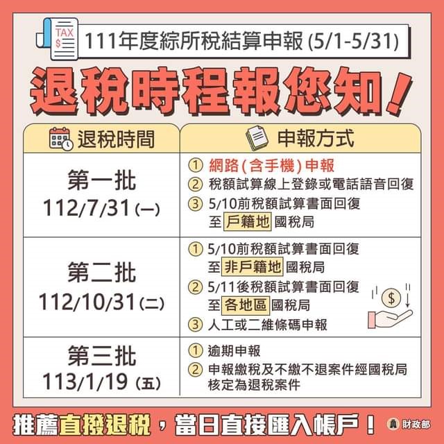 此外,推薦 #直撥退稅,時間到了自動匯入帳戶,更省時也更安全!提醒大家,國稅局不會打電話通知您到ATM轉帳退稅,